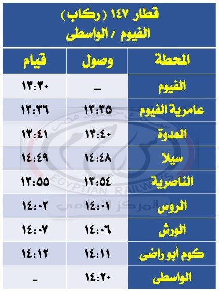 – تعديل ميعاد قطاري 147 و138 ركاب الفيوم / الواسطي والعكس كالجداول المرفقة.