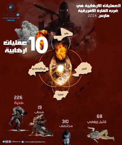 في إطار متابعته لأنشطة التنظيمات الإرهابية في إفريقيا، تابع مرصد الأزهر لمكافحة التطرف الأوضاع الأمنية في منطقة غرب إفريقيا حيث يتصدر تنظيما «داعش» و«القاعدة» المشهد، من خلال العمليات التي يتولى تنفيذها حركات متطرفة تتفرّع عن التنظيمين مثل «بوكو حرام» و«نصرة الإسلام والمسلمين»، فقد بلغت العمليات الإرهابية التي شنتها تلك التنظيمات في تلك المنطقة على مدار شهر مارس من العام الجاري (10) عمليات، أسفرت عن مقتل (226)، وإصابة (19)، واختطاف (310) آخرين.