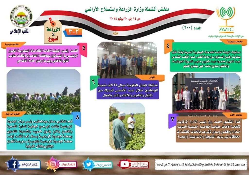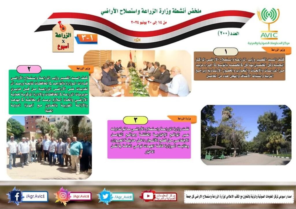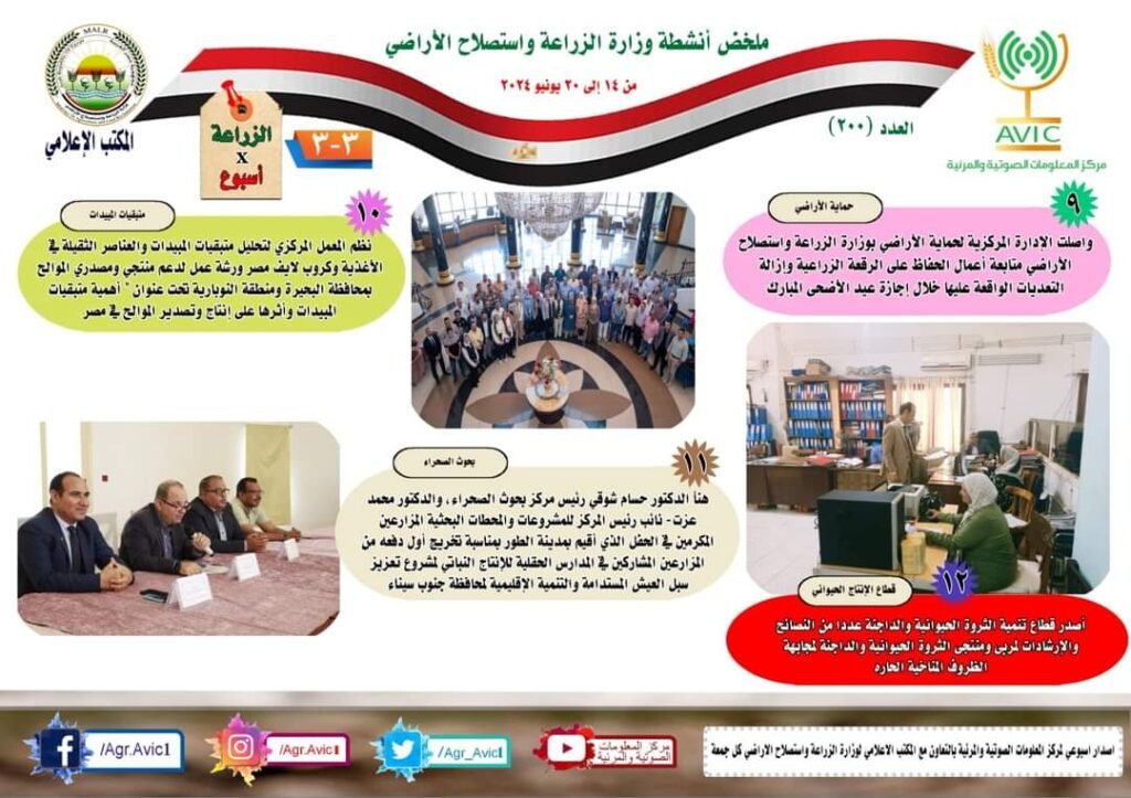 أصدر مركز المعلومات الصوتية والمرئية، التابع لوزارة الزراعة واستصلاح الاراضي، “الانفوجراف الاسبوعي” في نسخته رقم ٢٠٠ حول الحصاد الاسبوعي لأهم أنشطة الوزارة، خلال الاسبوع الماضي في الفترة من ١٣ وحتى ٢٠ يونيو الجاري، وذلك بالتعاون مع المكتب الاعلامي للوزارة، كما أصدر المركز ايضا ملخصا بالفيديو، حول انشطة الوزارة خلال نفس الفترة.