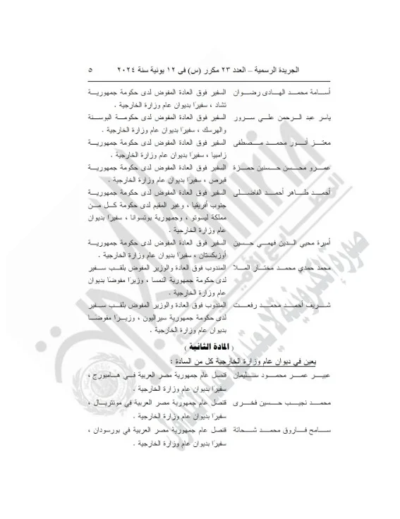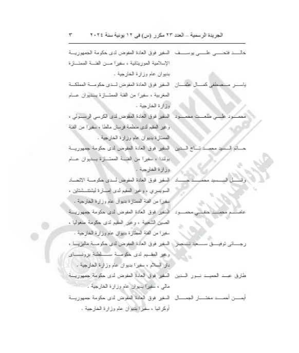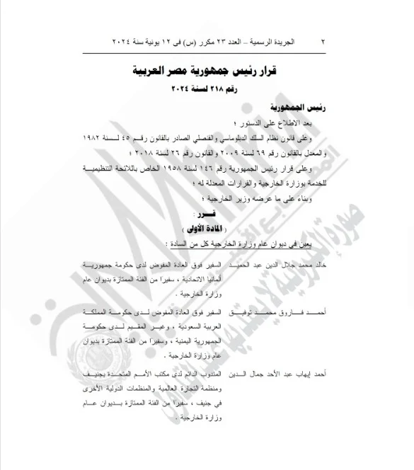 نشرت الجريدة الرسمية، القرار الجمهوري رقم 218 لسنة 2024 الصادر من الرئيس عبدالفتاح السيسي بالحركة الدبلوماسية والتي اعتمدها الرئيس وحركة تسكين السفراء العائدين من الخارج.