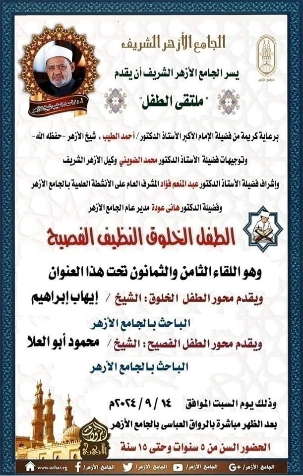 يواصل الجامع الأزهر الشريف غداً السبت، عقد حلقة جديدة من ملتقى الطفل، والذي يأتي تحت عنوان: ” الطفل الخلوق – النظيف – الفصيح”، وذلك تحت رعاية فضيلة الإمام الأكبر الأستاذ الدكتور أحمد الطيب شيخ الأزهر الشريف، وبمتابعة الدكتور محمد الضويني وكيل الأزهر الشريف، وإشراف الدكتور عبدالمنعم فؤاد، المشرف العام على الأنشطة العلمية للرواق الأزهري بالجامع الأزهر، والدكتور هاني عودة، مدير عام الجامع الأزهر الشريف.