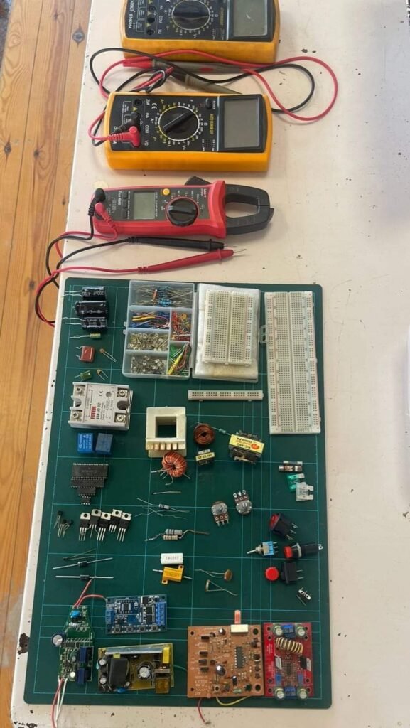 الكهرباء وأنواعها، قانون أوم والقدرة الكهربية، وحدات القياس وتحويلها، التيار المتردد والمستمر، الدائرة الكهربية والأسلاك، التوالي والتوازي في الجهود، المكونات الإلكترونية نظرياً وعملياً، أجهزة القياس، لوحة التجارب، المقاومة الثابتة والمتغيرة وتوصيلهما، المكثفات وأنواعها وتوصيلها، الملف وأنواعه والترانسفورمر، المفاتيح والسويتشات، الريليه وأنواعه، الترانزوستورات، الدوائر المتكاملة.
