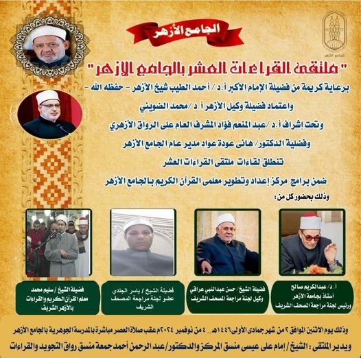 برعاية كريمة من فضيلة الإمام الأكبر أ. د. أحمد الطيب، شيخ الأزهر، يعقد مركز إعداد وتطوير معلمي القرآن الكريم بالجامع الأزهر، الملتقى اليومي للقراءات العشر غدًا بعد صلاة العصر بالمدرسة الجوهرية.