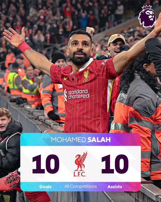 ونشر حساب ليفربول على منصة «إكس»، صورة تبرز إنجاز محمد صلاح (10 أهداف) و(10 تمريرات حاسمة) خلال 17 مباراة فقط وعلقت عليها بـ «مو صلاح هذا الموسم.. رائع للغاية».