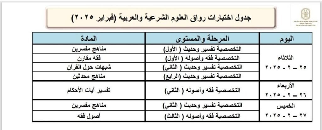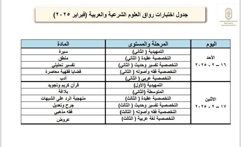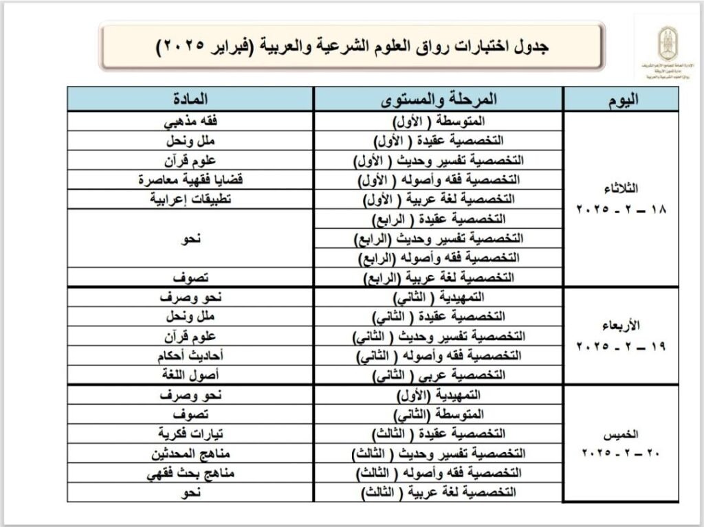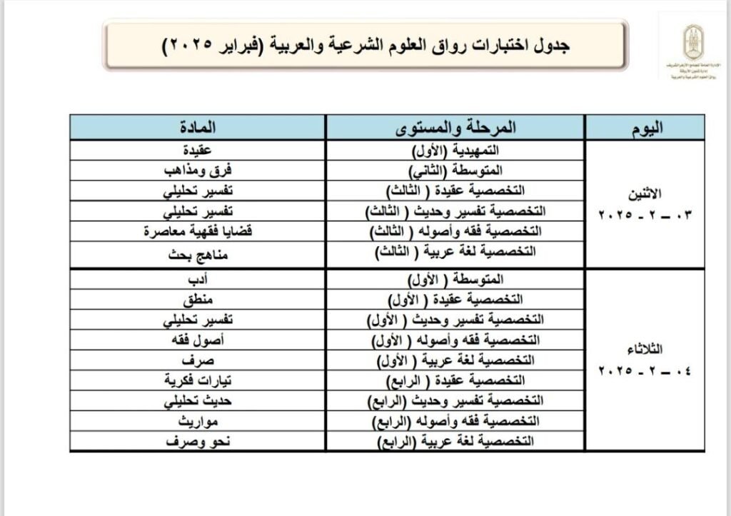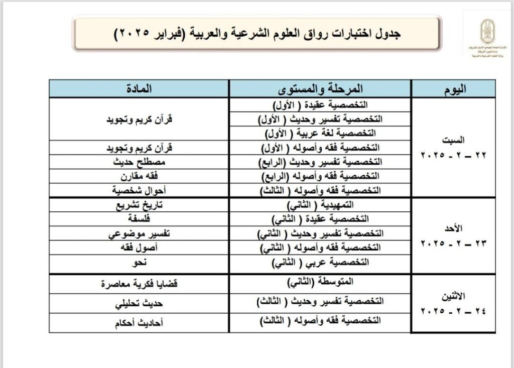برعاية فضيلة الإمام الأكبر أ. د. أحمد الطيب، شيخ الأزهر، يعلن الجامع الأزهر انطلاق اختبارات نهاية المستوى برواق العلوم الشرعية والعربية بالجامع الأزهر وفروع الرواق الأزهري بالمحافظات الخارجية، وذلك في الأول من فبراير 2025م، والتي من المقرر أن تستمر 30 يومًا، وستشمل الاختبارات كافة المناهج الدراسية التي تم تدريسها خلال فترة المستوى الدراسي بالرواق، وستُعقد الاختبارات في 27 مقرًا بفروع الرواق الأزهري في جميع أنحاء الجمهورية، ويشارك فيها حوالي 23474 دارسًا، موزعين على جميع أيام الاختبارات، وذلك وفقًا للجداول المرفقة على الصفحة الرسمية للجامع الأزهر.