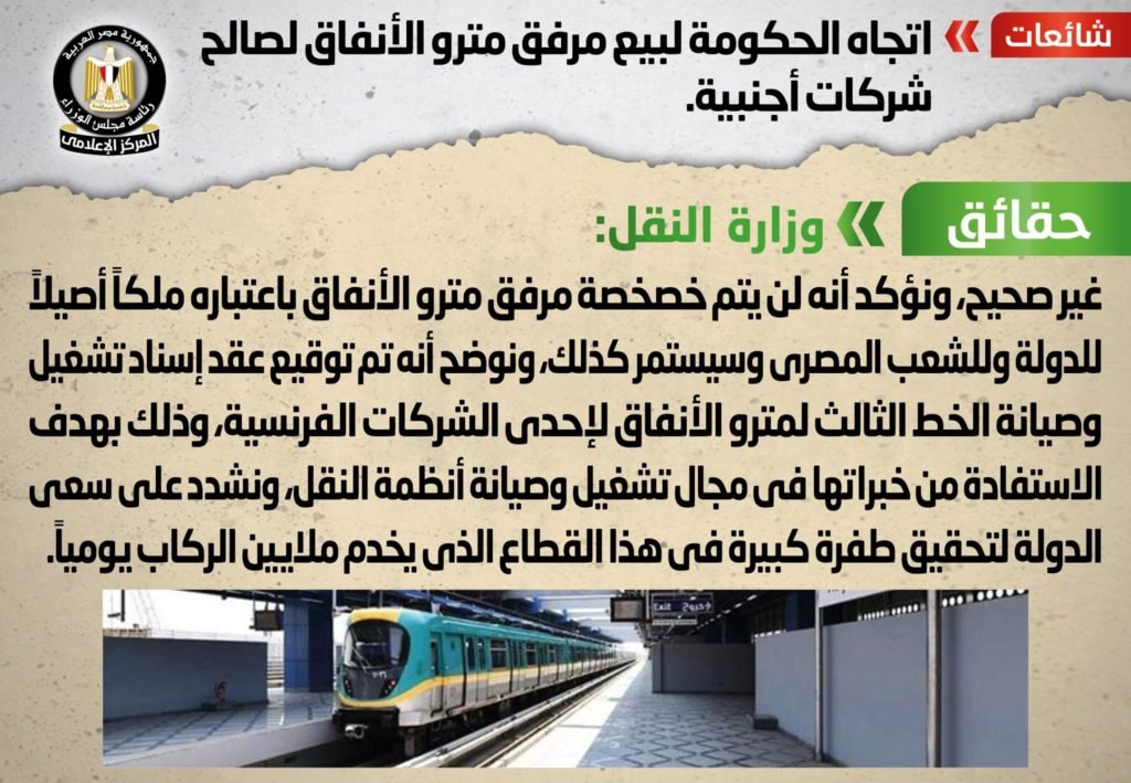 قال المركز الإعلامي لمجلس الوزراء، أن ما يتم تداوله بشأن اتجاه الحكومة لبيع «مترو الأنفاق» لصالح شركات أجنبية شائعات ليس لها أي أساس من الصحة.