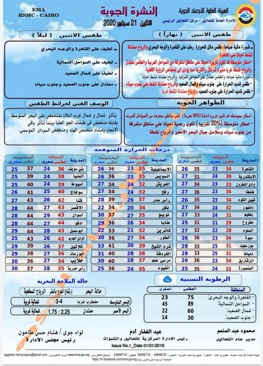 تتوقع هيئة الأرصاد الجوية، أن يشهد اليوم الاثنين ، شبورة مائية صباحا وطقس مائل للحرارة رطب على القاهرة والوجه البحرى، والرياح معتدلة تنشط أحيانا، فيما تشهد السواحل الشمالية الشرقية طقس معتدل وشبورة مائية صباحا، والرياح معتدلة تنشط أحيانا ، ويكون الطقس شديد الحرارة على جنوب سيناء والرياح معتدلة، فيما ترتفع نسبة الرطوبة بالقاهرة والوجه البحرى 75 % .