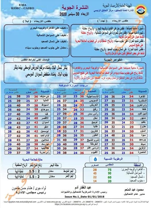 تتوقع هيئة الأرصاد الجوية، أن يسود اليوم الأربعاء، طقس حار على القاهرة والوجه البحرى، وشبورة مائية صباحا، والرياح معتدلة، وطقس مائل للحرارة على السواحل الشمالية، وشبورة مائية صباحاً، والرياح معتدلة تنشط أحيانا على السواحل الغربية، كما يتوقع الخبراء، أن يسود طقس شديد الحرارة على جنوب سيناء والرياح نشطة تؤدى إلى اضطراب الملاحة البحرية على خليج السويس، فيما يسود طقس شديد الحرارة على شمال الصعيد وجنوب الصعيد والرياح معتدلة، تنشط على بعض المناطق تكون مثيرة للرمال والأتربة.