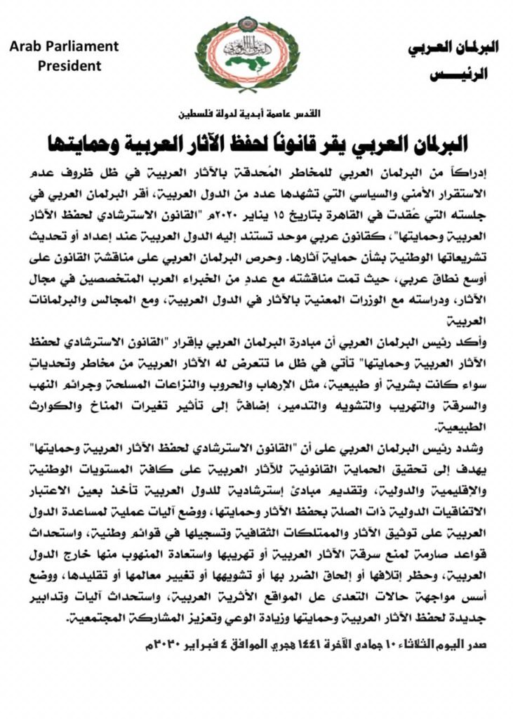 أقر البرلمان العربي ،اليوم، القانون الاسترشادي لحفظ الآثار العربية وحمايتها”، كقانون عربي موحد تستند إليه الدول العربية عند إعداد أو تحديث تشريعاتها الوطنية بشأن حماية آثارها، إدراكاً من البرلمان العربي للمخاطر المُحدقة بالآثار العربية في ظل ظروف عدم الاستقرار الأمني والسياسي التي تشهدها عدد من الدول العربية.