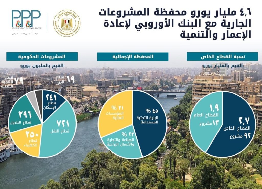 وتبلغ محفظة المشروعات الجارية للبنك الأوروبي لإعادة الإعمار والتنمية في مصر نحو 4.6 مليار يورو، منها 2.7 مليار يورو للقطاع الخاص في 92 مشروعًا ونحو 1.9 مليار يورو للقطاع الحكومي في 13 مشروعًا، وتتوزع المحفظة الإجمالية بنسبة 45% للبنية التحتية المستدامة و23% للصناعة والتجارة والأعمال الزراعية، و31% للمؤسسات المالية.
