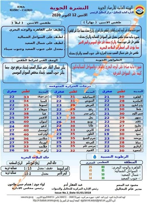 تتوقع هيئة الأرصاد الجوية أن يسود، اليوم الاثنين، طقس مائل للحرارة على الوجه البحرى والقاهرة، وشبورة مائية صباحا، والرياح معتدلة تنشط أحيانا على القاهرة، وطقس معتدل على السواحل الشمالية، وشبورة مائية صباحا والرياح معتدلة، ويسود طقس حار على جنوب سيناء، والرياح نشطة على خليج السويس والبحر الحمر مما يؤدى إلى اضطراب الملاحة البحرية، وطقس حار على شمال الصعيد، شديد الحرارة على جنوب الصعيد والرياح معتدلة.