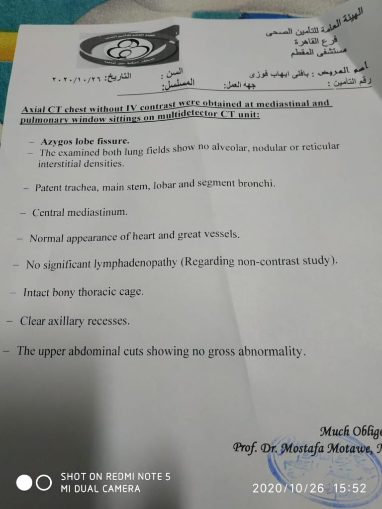 وبناء عليه فقد أظهرت الأشعة المقطعية للطالب الآن وتفيد خلو الرئة من التهاب الكورونا .