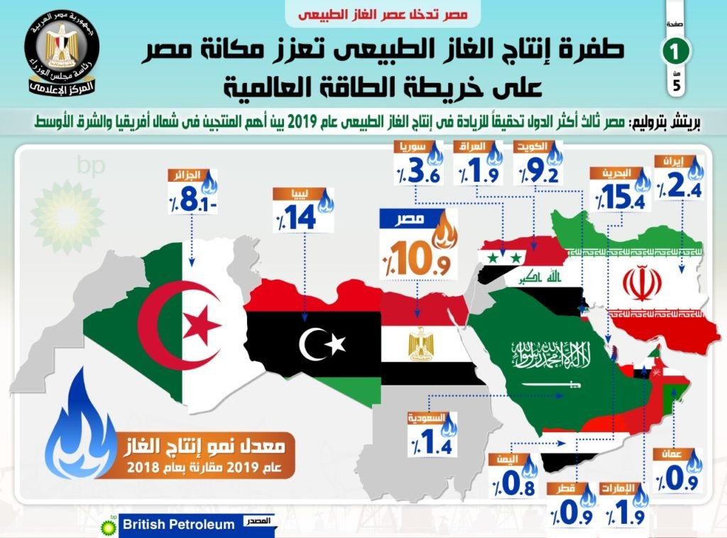 يأتي ذلك، بينما احتلت مصر وفقاً لبريتش بتروليم المركز الثالث كأكثر الدول تحقيقاً لزيادة في إنتاج الغاز الطبيعي على مستوى الدول المنتجة في شمال أفريقيا والشرق الأوسط عام 2019، وذلك بنسبة زيادة تصل لـ 10.9% مقارنة بعام 2018، بينما جاءت ليبيا في المركز الثاني بنسبة زيادة في إنتاجها من الغاز الطبيعي تصل لـ 14%، في حين حصلت البحرين على المركز الأول مسجلةً 15.4%.