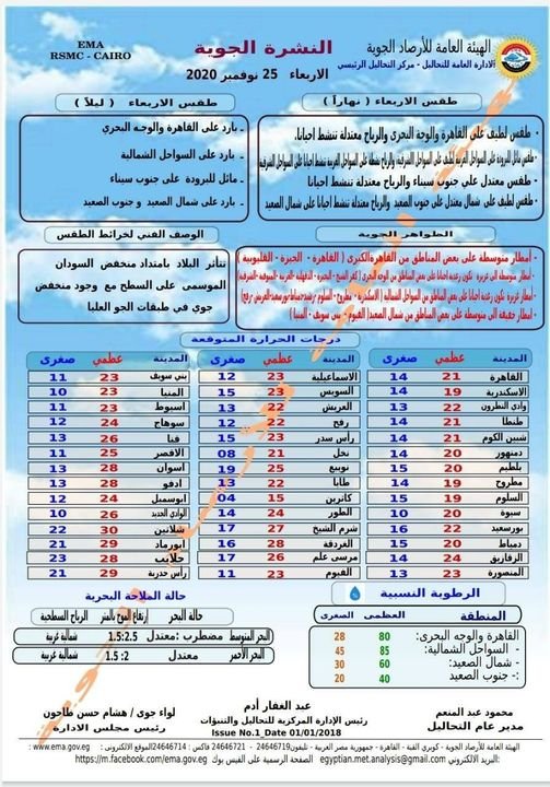 وقع خبراء هيئة الأرصاد الجوية أن تتعرض البلاد لحالة من عدم الاستقرار في الأحوال الجوية بداية من اليوم الأربعاء 25 نوفمبر وتستمر إلى الجمعة 27 نوفمبر