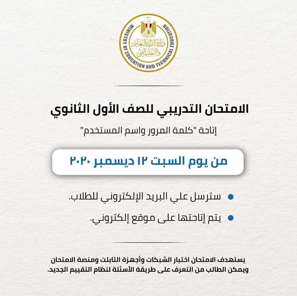 أعلنت وزارة التربية والتعليم والتعليم الفني، عن بدء الامتحانات التدريبية للصف الأول الثانوي يوم الثلاثاء المقبل ١٥ ديسمبر ٢٠٢٠، وسيتم إرسال “كلمة المرور واسم المستخدم” للطالب على البريد الإلكتروني بدءاً من يوم السبت ١٢ ديسمبر ٢٠٢٠.