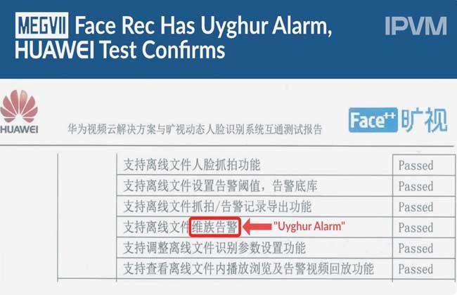 وقالت منظمة IPVM إن النظام الذي طورته هواوي به خاصية Uighur Alert والتي تعني “تنبيه إيجور” والتي تستخدم تقنية التعرف علي الوجوه لتحديد إثنية الشخص وتنشيط تنبيها إذا كان الشخص الذي رصدته من أقلية الايغور أم لا.