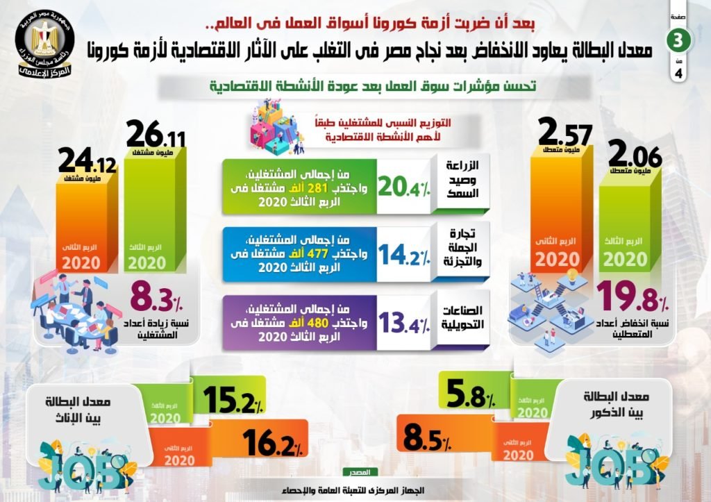 يأتي هذا في حين، زادت أعداد المشتغلين بنسبة 8.3%، حيث بلغت 26.11 مليون مشتغل في الربع الثالث من عام 2020 مقارنة بـ 24.12 مليون مشتغل في الربع الثاني من نفس العام.