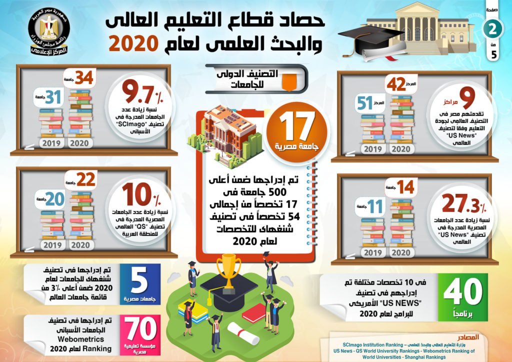 وفي سياق متصل، زاد عدد الجامعات المصرية المدرجة في تصنيف QS العالمي للمنطقة العربية بنسبة 10%، حيث وصل عددها إلى 22 جامعة مقارنة بـ 20 جامعة عام 2019، كما تم إدراج 70 مؤسسة تعليمية في تصنيف الجامعات الإسباني Ranking Webometrics لعام 2020.