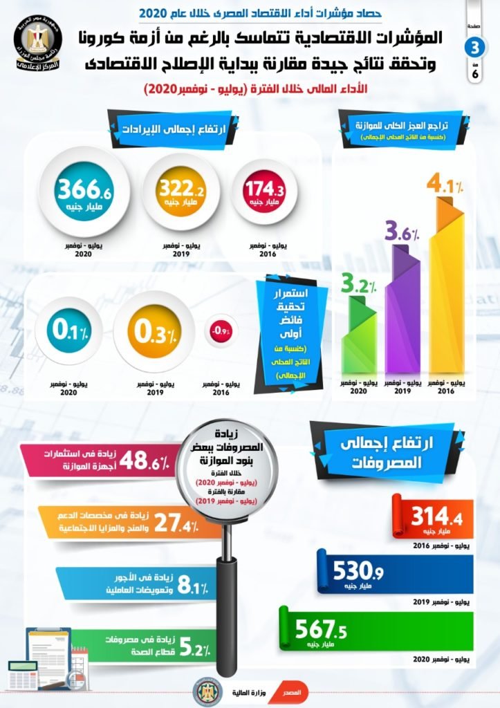 وفى السياق نفسه ، أشار التقرير إلى ارتفاع إجمالى المصروفات خلال الفترة من يوليو حتى نوفمبر عام 2020، حيث سجلت 567.5 مليار جنيه، مقارنة بـ 530.9 مليار جنيه للفترة ذاتها عام 2019، و314.4 مليار جنيه لنفس الفترة عام 2016.