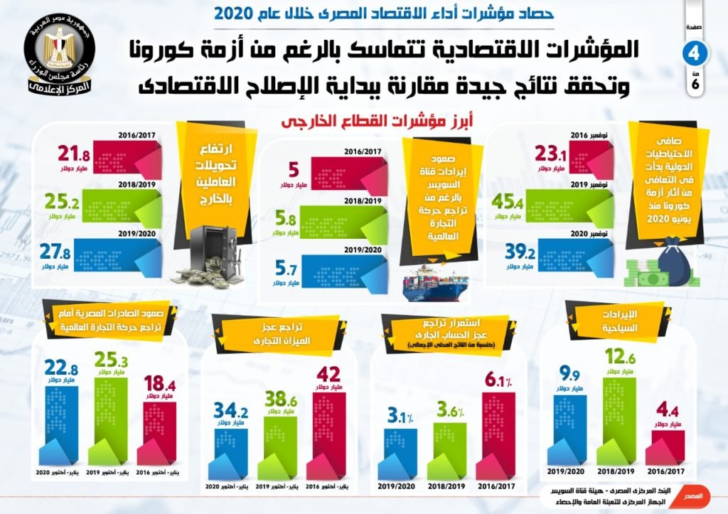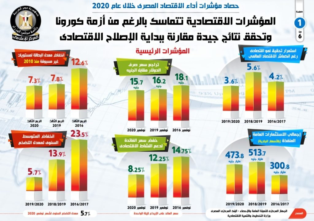 وفى إطار سلسلة متتابعة من التقارير لرصد إنجازات الحكومة فى 2020، نشر المركز الإعلامى لمجلس الوزراء، تقريرًا فى هذا الخصوص والذى تضمن إنفوجرافات تسلط الضوء على تماسك المؤشرات الاقتصادية وتحقيقها نتائج جيدة فى حصاد عام 2020 مقارنة ببداية الإصلاح الاقتصادي.