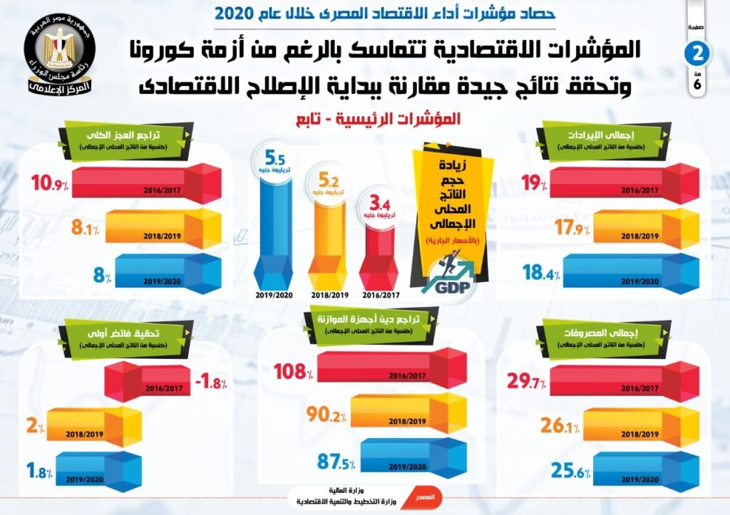 كما كشف التقرير عن زيادة حجم الناتج المحلى الإجمالى (بالأسعار الجارية) خلال عام 2019/2020 مسجلًا 5.5 تريليون جنيه، مقارنة بـ 5.2 تريليون جنيه عام 2018/2019، و3.4 تريليون جنيه عام 2016/2017.