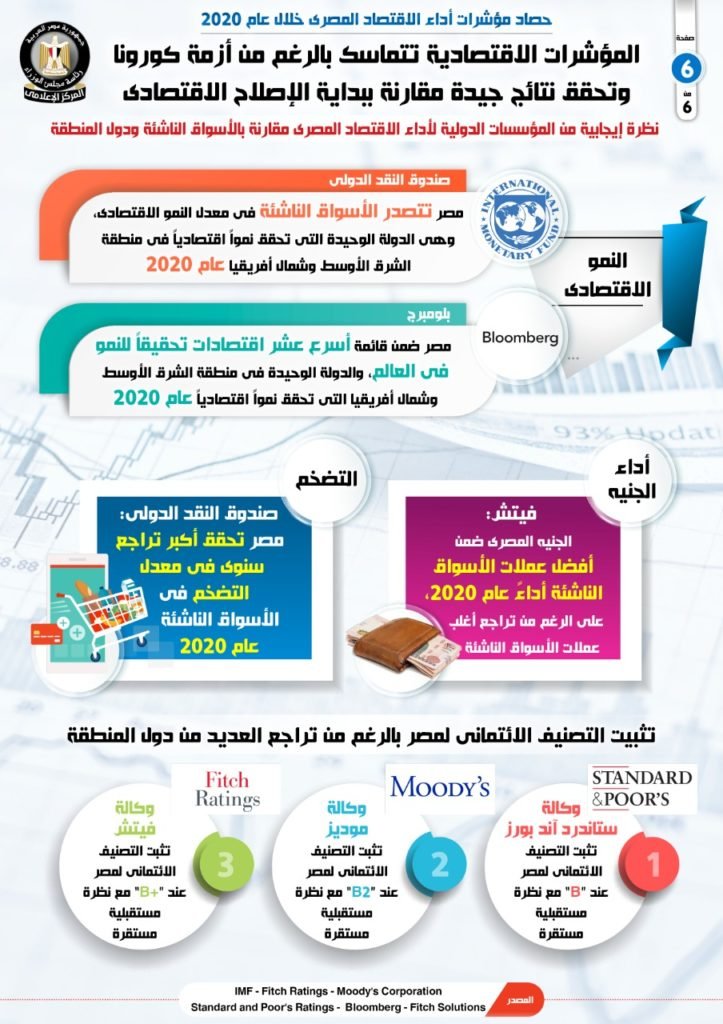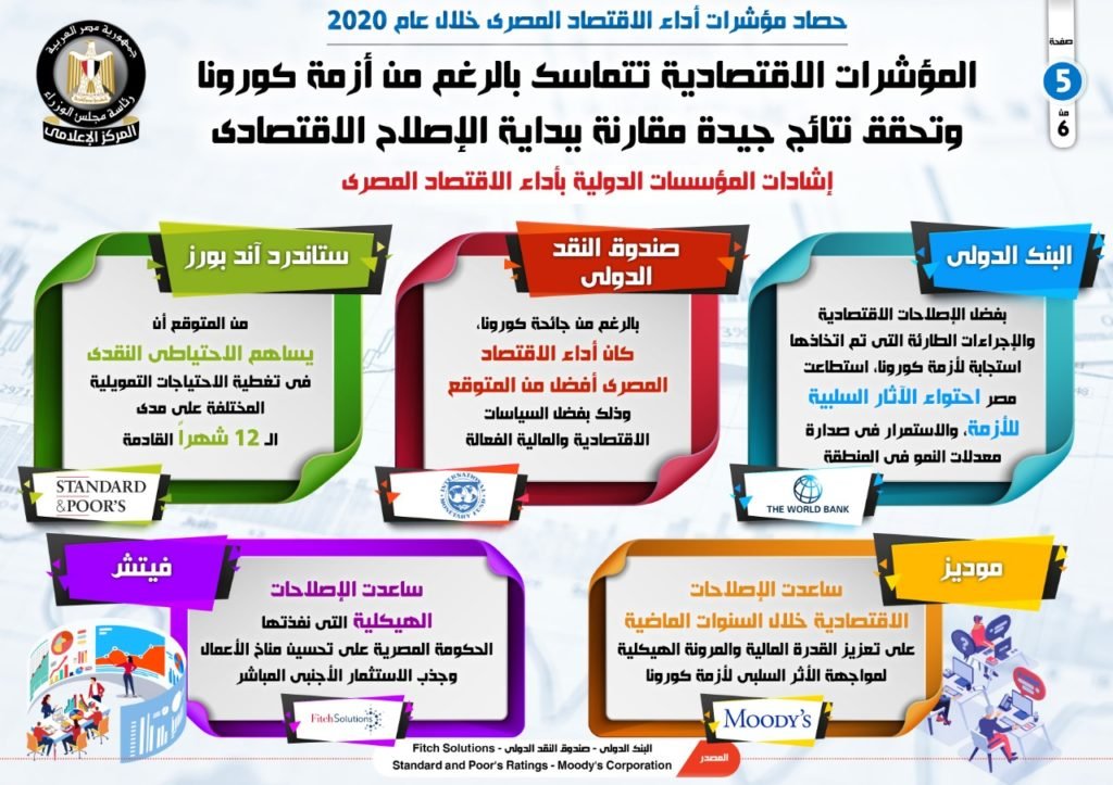 أكدت وكالة موديز أن الإصلاحات الاقتصادية التى قامت بها مصر خلال السنوات الماضية ساعدت فى تعزيز القدرة المالية والمرونة الهيكلية لمواجهة الأثر السلبى لأزمة كورونا، كما أكدت فيتش على أن الإصلاحات الهيكلية التى نفذتها الحكومة المصرية ساعدت على تحسين مناخ الأعمال وجذب الاستثمار الأجنبى المباشر.