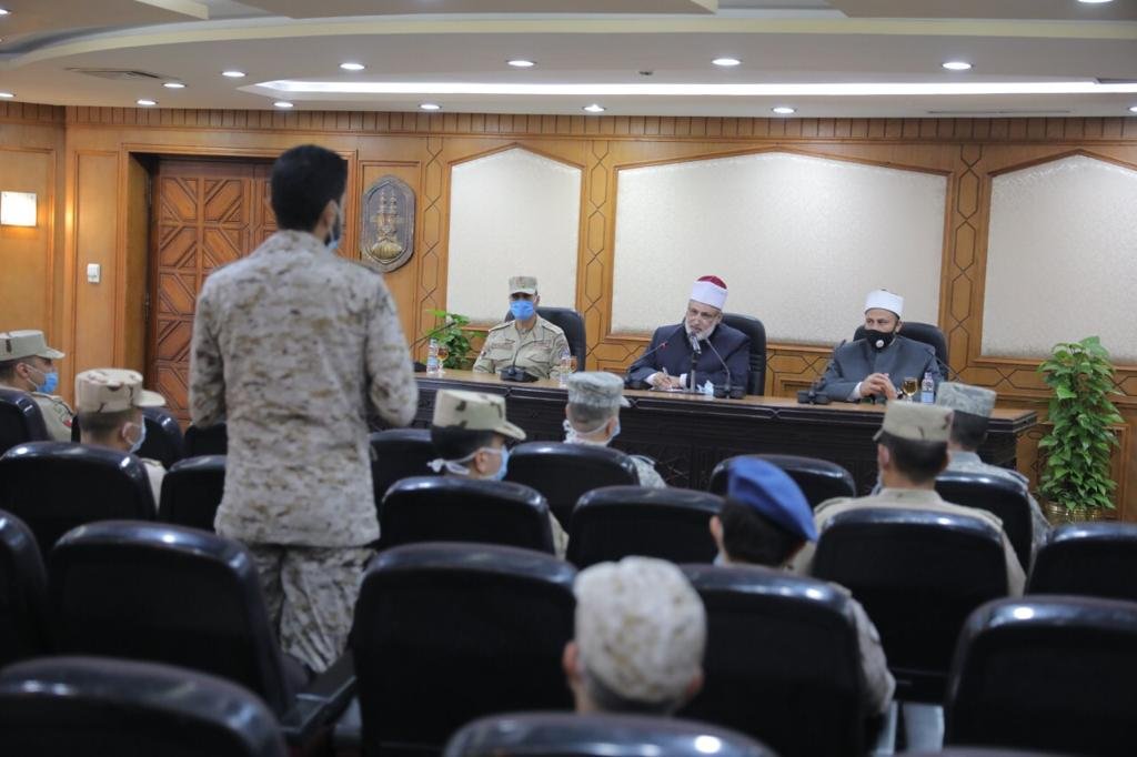 ورحب وكيل الأزهر بضباط مصر والدول العربية الدراسين بالكلية وأعرب عن خالص تقديره لقيادة الكلية وحرصهم على الاستفادة من خبرات الأزهر في مجال نشر الفكر المعتدل، مؤكدًا أن الأزهر له تاريخ حافل منذ نشأته في هذا المجال وقدَّم فكرًا مستنيرًا ودعوة راشدة تقوم على الوسطية وسماحة الإسلام، وأن رسالة الأزهر رسالة عالمية ودوره بارز في مختلف دول العالم ويستقبل على مدار العام طلابًا وباحثين وأئمة من أكثر من 100 دولة للدراسة والحصول على الدورات التدريبية والتأهيلية بفضل مناهجه التي تكفل التنوع والاختلاف وتحارب التشدد والمغالاة.