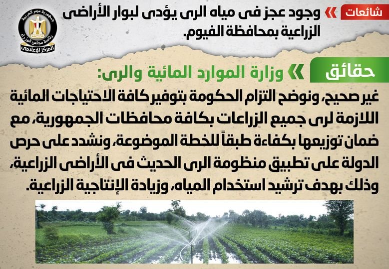 قد قام المركز الإعلامي لمجلس الوزراء بالتواصل مع وزارة الموارد المائية والري، والتي نفت تلك الأنباء، مُؤكدةً أنه لا صحة لوجود عجز في مياه الري سواء بمحافظة الفيوم أو غيرها من المحافظات، مُوضحةً التزام الحكومة بتوفير كافة الاحتياجات المائية اللازمة لري جميع الزراعات بكافة محافظات الجمهورية، مع ضمان توزيعها بكفاءة طبقاً للخطة الموضوعة، مُشددةً على حرص الدولة على تطبيق منظومة الري الحديث في الأراضي الزراعية، وذلك بهدف ترشيد استخدام المياه، وزيادة الإنتاجية الزراعية.