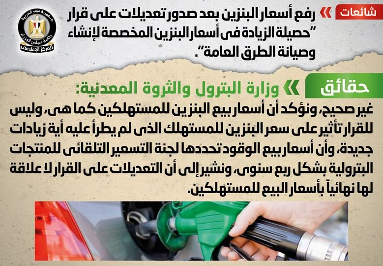 وقد قام المركز الإعلامي لمجلس الوزراء بالتواصل مع وزارة البترول والثروة المعدنية، والتي نفت تلك الأنباء، مُؤكدةً أنه لا صحة لرفع أسعار البنزين بعد صدور تعديلات على قرار “حصيلة الزيادة في أسعار البنزين المخصصة لإنشاء وصيانة الطرق العامة”، مُوضحةً أن أسعار بيع البنزين للمستهلكين كما هي، وليس للقرار تأثير على سعر البنزين للمستهلك الذي لم يطرأ عليه أية زيادات جديدة، وأن أسعار بيع الوقود تحددها لجنة التسعير التلقائي للمنتجات البترولية بشكل ربع سنوي.