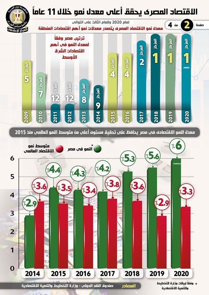 في دلالة واضحة على استمرار تحسن أداء الاقتصاد المصري ونجاح تطبيق سياسات برنامج الإصلاح الاقتصادي التي تبنتها الدولة منذ عام 2016، حقق الاقتصاد المصري أعلى معدل نمو له خلال 11 عاماً في وقت يظل فيه متصدراً معدلات نمو أهم اقتصادات المنطقة لعام 2020، وللعام الثالث على التوالي.