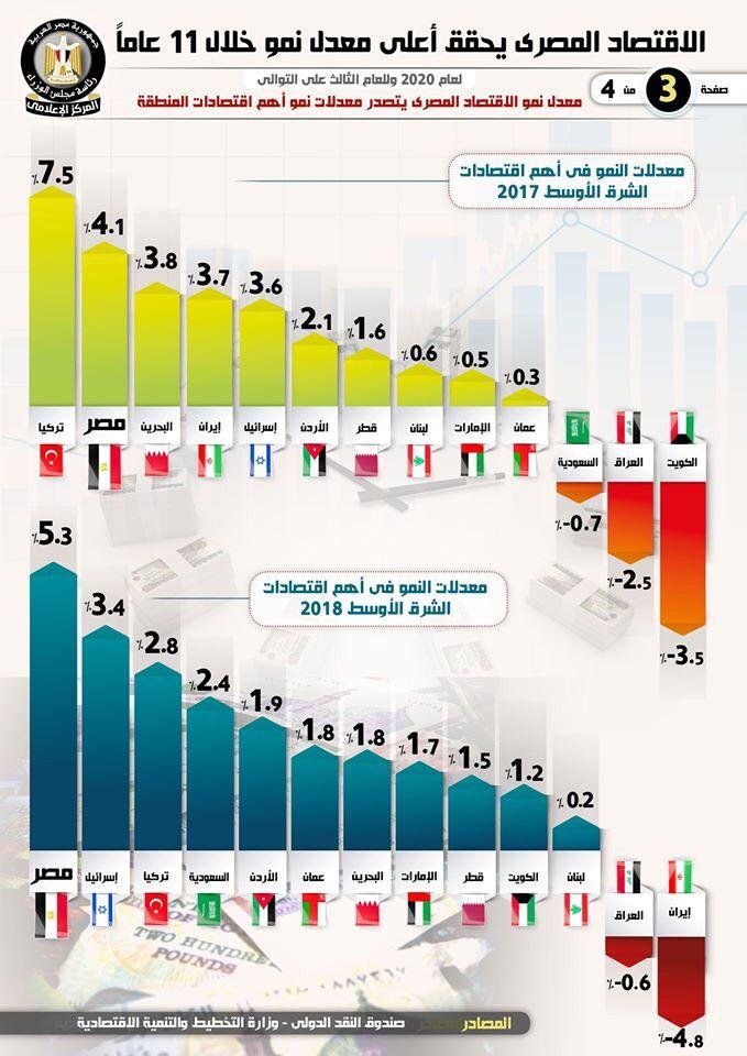 وكشف الإنفوجراف، تصدر مصر لعام2020 وللعام الثالث على التوالي معدلات نمو أهم اقتصادات الشرق الأوسط لتسجل 6% “مستهدف” تليها العراق بمعدل نمو 5.1% ثم عمان بمعدل نمو 3.7% وإسرائيل بمعدل نمو 3.1% وتركيا بمعدل نمو 3%، وذلك بعد أن احتلت المركز الثاني خلال عام 2017 والتي سجلت فيه معدل نمو 4.1%، تليها البحرين بمعدل نمو 3.8%، ثم إيران بمعدل نمو 3.7%، وإسرائيل بمعدل نمو 3.6%، وفي المقابل انكمش الناتج المحلي الإجمالي للسعودية بنسبة 0.7%، تليها العراق بنسبة 2.5%، والكويت بنسبة 3.5%.