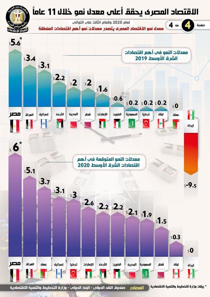 وبشأن ترتيب معدل النمو لمصر في أهم اقتصادات الشرق الأوسط خلال الفترة من 2009 حتى 2019، فقد أبرز الإنفوجراف، أنه في عام 2009، احتلت مصر المرتبة الـ 5 على مستوى أهم اقتصادات الشرق الأوسط، في حين احتلت المرتبة الـ 7 خلال عام 2010، والمرتبة الـ 12 خلال عامي 2011، و2012، كما احتلت المرتبة الـ 8 خلال عام 2013، والمرتبة الـ 9 خلال عام 2014، أما في عامي 2015، و2016 فقد احتلت مصر المرتبة الـ 4، في حين احتلت المرتبة الـ 2 عام 2017، ليستمر معدل النمو في الصعود لتحتل مصر المرتبة الأولى لأهم اقتصادات الشرق الأوسط خلال عامي 2018، و2019، مع توقع استمرار تصدرها أيضاً في عام 2020.