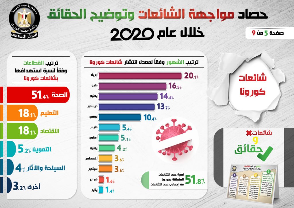 وأكد التقرير، أن نسبة عدد الشائعات المتعلقة بجائحة كورونا بلغت 51.8% من إجمالي عدد الشائعات، مشيراً في الوقت نفسه إلى ترتيب القطاعات وفقاً لنسبة استهدافها بشائعات كورونا، حيث جاءت الصحة في المقدمة بنسبة 51.4%، والتعليم بنسبة 18.1%، والاقتصاد بنسبة 18.1%، والتموين بنسبة 5.2%، والسياحة والآثار بنسبة 4%، والقطاعات الأخرى بنسبة 3.2%.