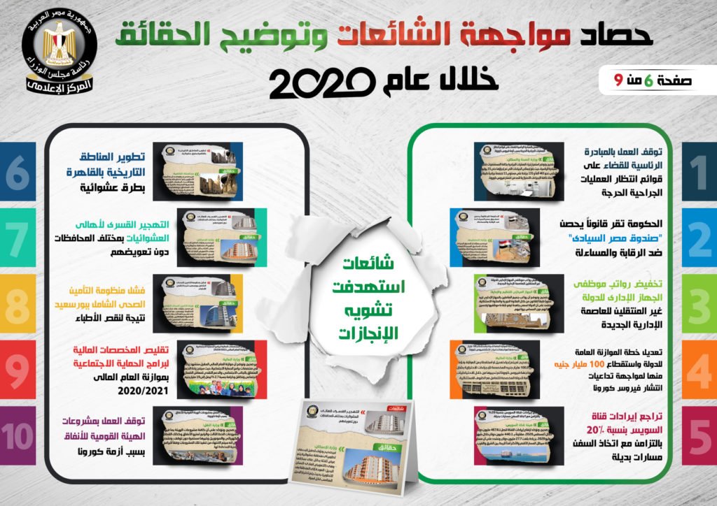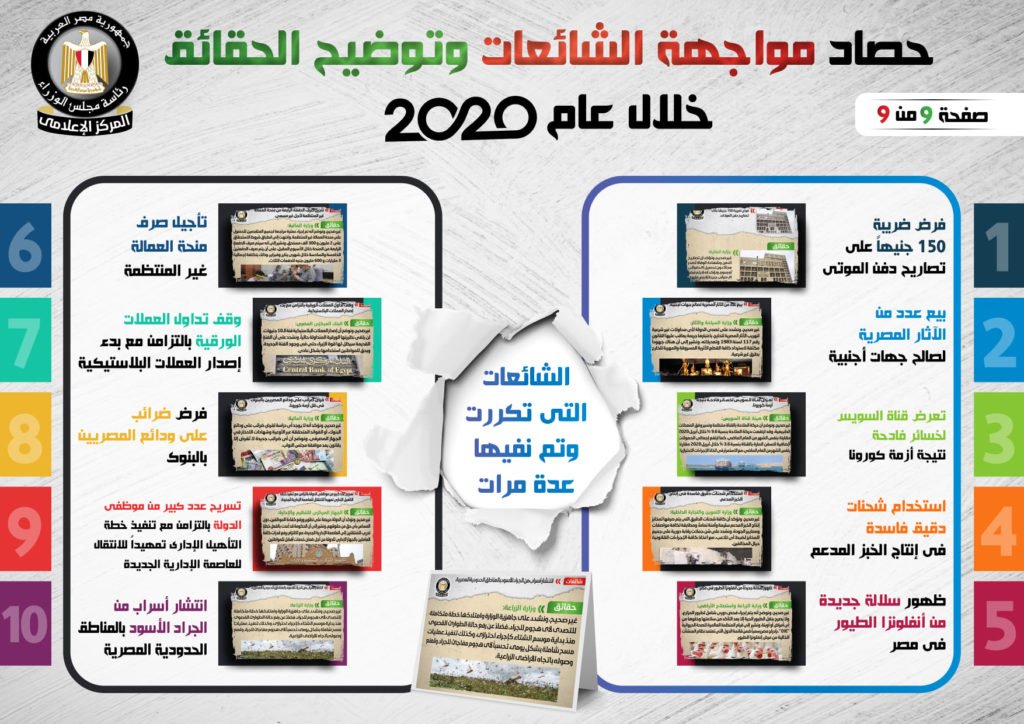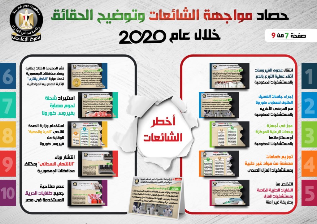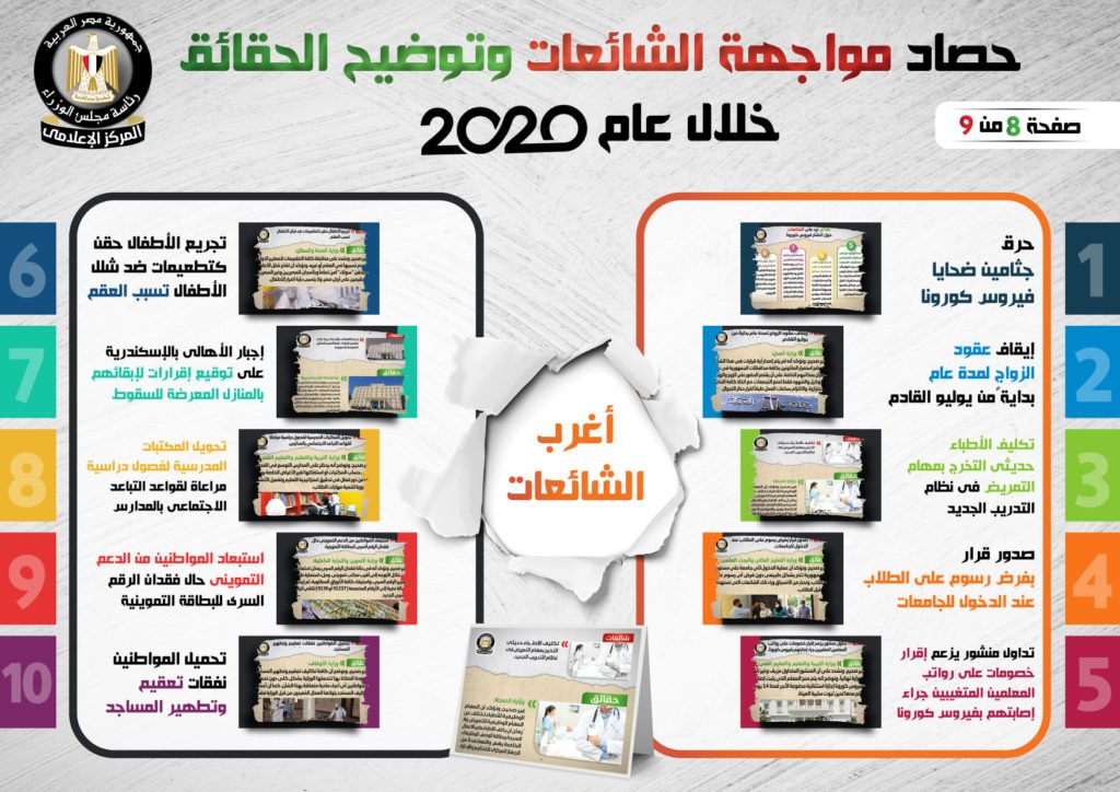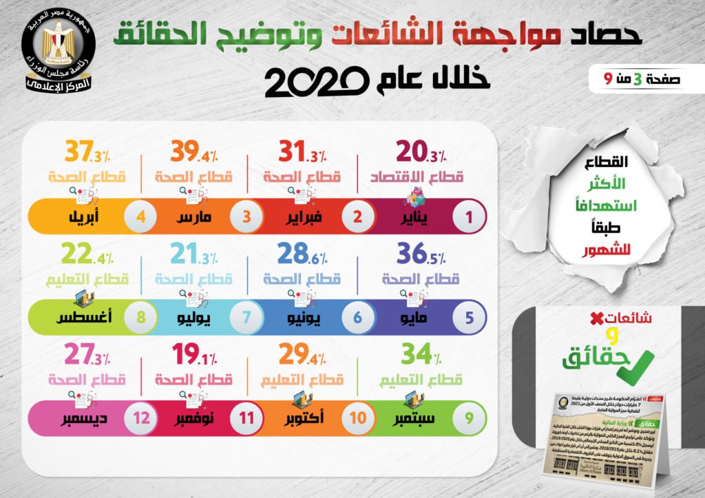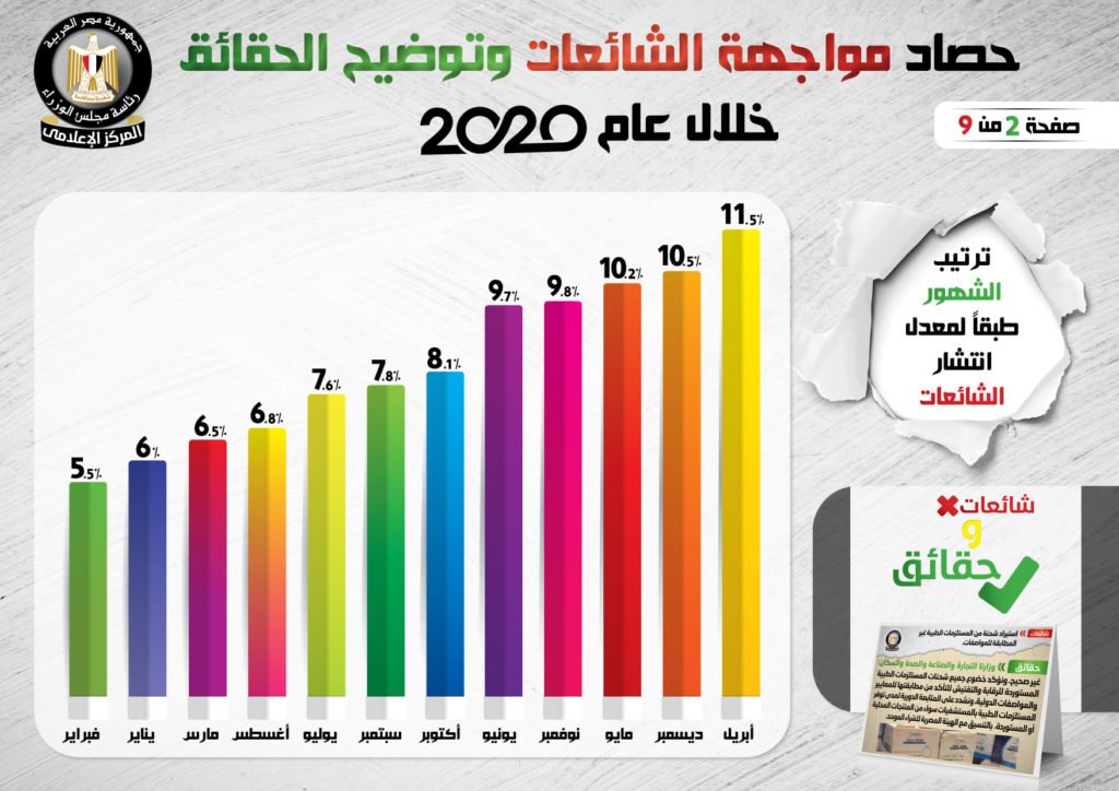 نشر المركز الإعلامي لمجلس الوزراء، تقريراً تضمن إنفوجرافات سلطت الضوء على حصاد مواجهة الشائعات وتوضيح الحقائق على مدار عام 2020.