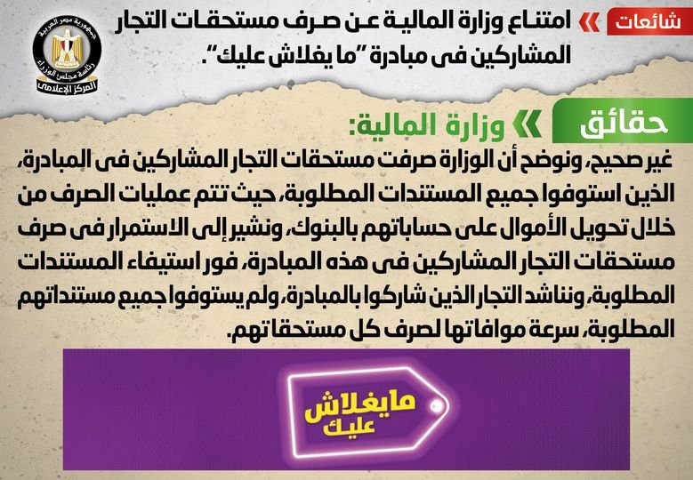 نفى المركز الإعلامي لمجلس الوزراء، ما تم تداوله بشأن امتناع وزارة المالية عن صرف مستحقات تجار مبادرة «ما يغلاش عليك».