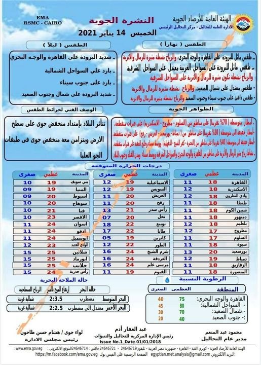 وتتوقع الأرصاد، أن يكون الطقس شديد البرودة ليلا على القاهرة والوجه البحرى، وباردا على السواحل الشمالية، باردا على جنوب سيناء، شديد البرودة على شمال وجنوب الصعيد.