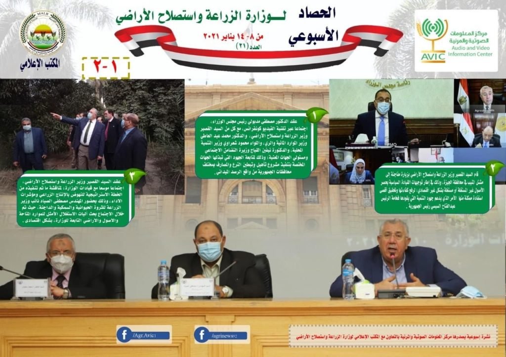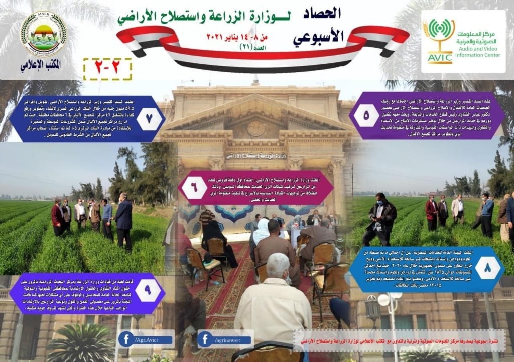 اصدر مركز المعلومات الصوتية والمرئية، التابع لوزارة الزراعة واستصلاح الاراضي، “الانفوجراف الاسبوعي” في نسخته رقم 21، حول الحصاد الاسبوعي لأهم أنشطة الوزارة، خلال الاسبوع الماضي في الفترة من 8 الى 14 يناير، وذلك بالتعاون مع المكتب الاعلامي للوزارة.