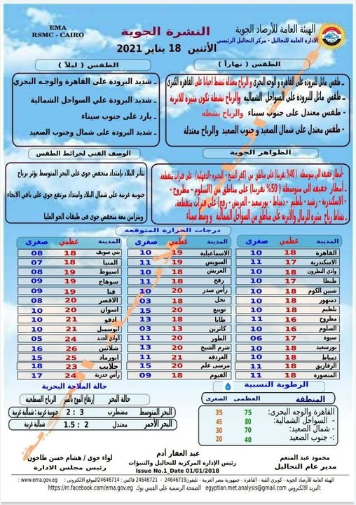 كما تتوقع هيئة الأرصاد، أن يسود طقس معتدل على شمال الصعيد، والرياح معتدلة، وطقس معتدل على جنوب الصعيد والرياح معتدلة.