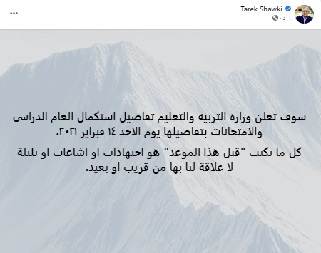وقال «شوقي» في منشور له: «سوف تعلن وزارة التربية والتعليم تفاصيل استكمال العام الدراسي والامتحانات بتفاصيلها يوم الاحد ١٤ فبراير ٢٠٢١، كل ما يكتب “قبل هذا الموعد” هو اجتهادات او اشاعات او بلبلة لا علاقة لنا بها من قريب او بعيد».
