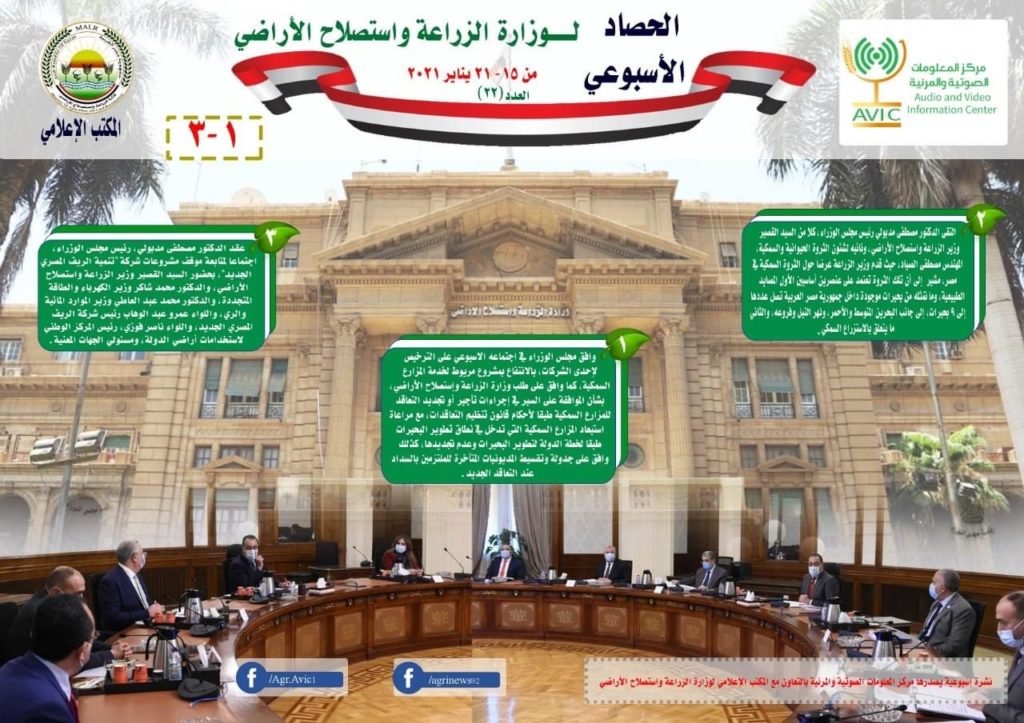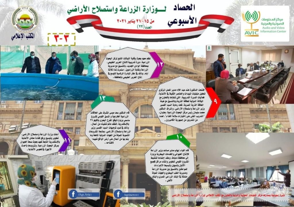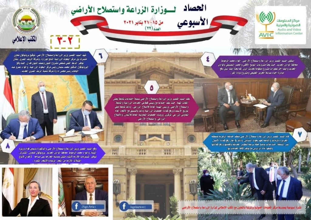 اصدر مركز المعلومات الصوتية والمرئية، التابع لوزارة الزراعة واستصلاح الاراضي، “الانفوجراف الاسبوعي” في نسخته رقم 22، حول الحصاد الاسبوعي لأهم أنشطة الوزارة، خلال الاسبوع الماضي في الفترة من 15 الى 21 يناير، وذلك بالتعاون مع المكتب الاعلامي للوزارة.