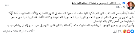 وقال الرئيس في منشور له : «أهنئ أبنائي من المنتخب الوطني لكرة اليد على الصعود المستحق لدور الثمانية والأداء المشرف، كما أؤكد على فخري ودعمي الدائم لجميع النماذج الرياضية المصرية المشرفة وكافة الأنشطة الرياضية في مصر باعتبارها من أهم ركائز بناء الإنسان».