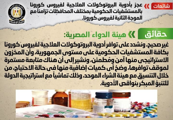 وقد قام المركز الإعلامي لمجلس الوزراء بالتواصل مع هيئة الدواء المصرية، والتي نفت تلك الأنباء، مُؤكدةً أنه لا صحة لوجود أي عجز بأدوية البروتوكولات العلاجية لفيروس كورونا بالمستشفيات الحكومية بمختلف المحافظات تزامناً مع الموجة الثانية لفيروس كورونا.