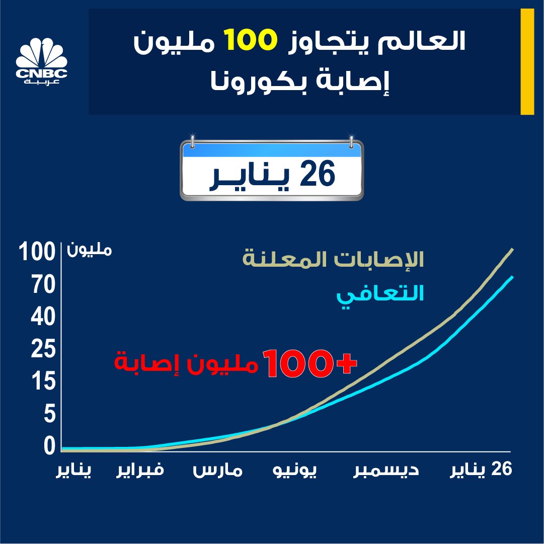 ما زال عداد كورونا يسجل أرقامًا قياسية في أعداد المصابين حول العالم، حيث شهد العالم مع بداية اليوم الثلاثاء، تجاوز في حالات الإصابة بفيروس كورونا عن 100 مليون إصابة، وفق نبأ عاجل للفضائية CNBC