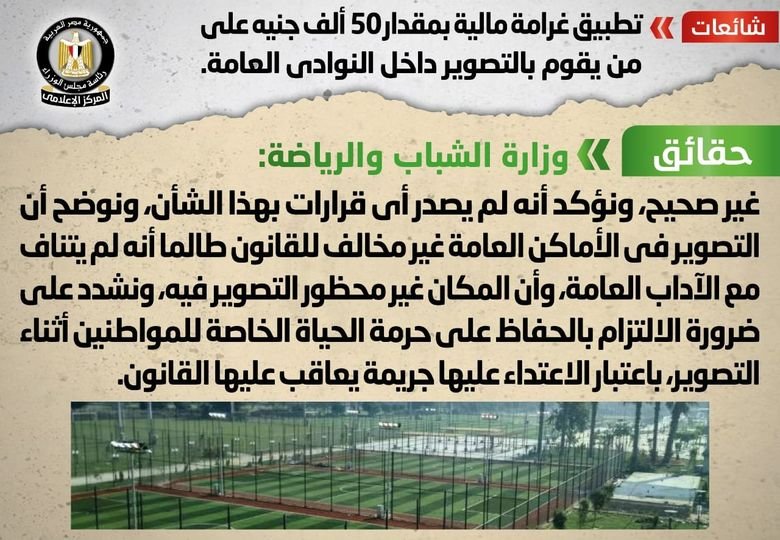 وقد قام المركز الإعلامي لمجلس الوزراء بالتواصل مع وزارة الشباب والرياضة، والتي نفت تلك الأنباء، مُؤكدةً أنه لا صحة لتطبيق غرامة مالية بمقدار 50 ألف جنيه على من يقوم بالتصوير داخل النوادي العامة، وأنه لم يصدر أي قرارات بهذا الشأن، مُوضحةً أن التصوير في الأماكن العامة غير مخالف للقانون طالما أنه لم يتناف مع الآداب العامة، وأن المكان غير محظور التصوير فيه.