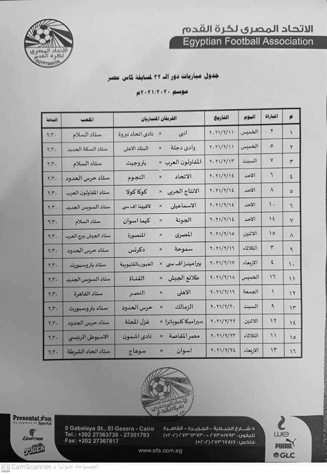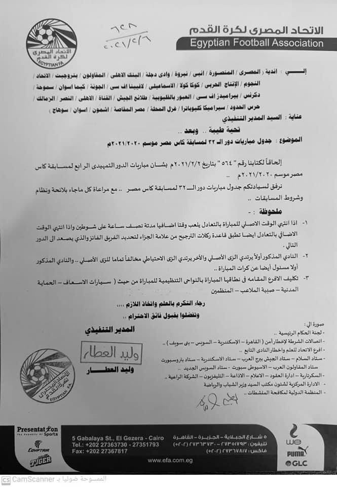 أرسلت اللجنة الثلاثية، التى تدير اتحاد الكرة خطابات للأندية المشاركة فى دور الـ32 لبطولة كأس مصر هذا الموسم، وتضمنت جدول ملاعب ومواعيد جميع المباريات والتى ستقام جميعها فى الثانية والنصف ظهرًا، كما تم إخطار الأندية بشروط مباريات كأس مصر فى دور الـ32.