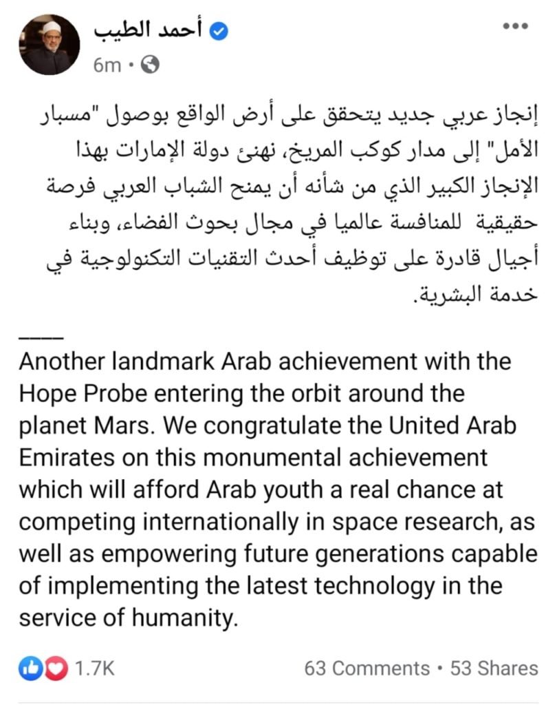 وقال شيخ الأزهر، في منشور له على فيس بوك: «إنجاز عربي جديد يتحقق على أرض الواقع بوصول “مسبار الأمل” إلى مدار كوكب المريخ، نهنئ دولة الإمارات بهذا الإنجاز الكبير الذي من شأنه أن يمنح الشباب العربي فرصة حقيقية للمنافسة عالميا في مجال بحوث الفضاء، وبناء أجيال قادرة على توظيف أحدث التقنيات التكنولوجية في خدمة البشرية».