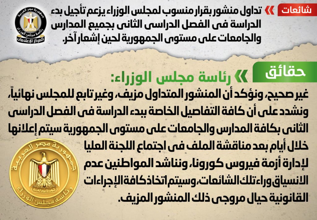 وأكدت رئاسة مجلس الوزراء أن المنشور المتداول مزيف، وغير تابع للمجلس نهائياً.. مشددة على أن كافة التفاصيل الخاصة ببدء الدراسة في الفصل الدراسي الثاني بكافة المدارس والجامعات على مستوى الجمهورية سيتم إعلانها خلال أيام بعد مناقشة الملف في اجتماع اللجنة العليا لإدارة أزمة فيروس كورونا.