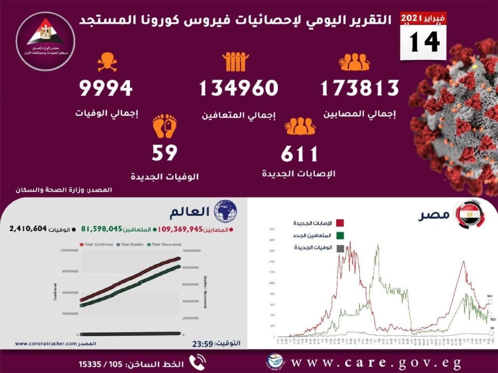 وشملت الإحصائية، تسجيل 611 حالة جديدة ثبتت إيجابية تحاليلها معمليًا للفيروس، وذلك ضمن إجراءات الترصد والتقصي والفحوصات اللازمة التي تُجريها الوزارة وفقًا لإرشادات منظمة الصحة العالمية، بالإضافة إلى تسجيل وفاة 59 حالة جديدة.