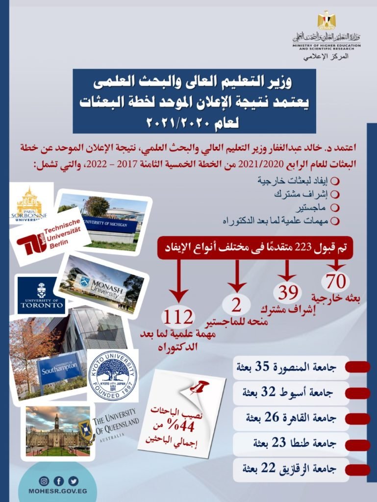 اعتمد د. خالد عبدالغفار وزير التعليم العالي والبحث العلمي، نتيجة الإعلان الموحد عن خطة البعثات للعام الرابع 2020/2021 من الخطة الخمسية الثامنة 2017 – 2022، والتي تشمل إيفاد لبعثات خارجية – إشراف مشترك ـ مهمات علمية لما بعد الدكتوراه ـ ماجستير).