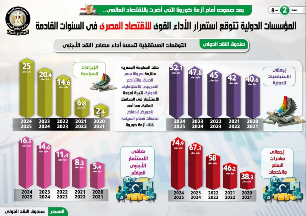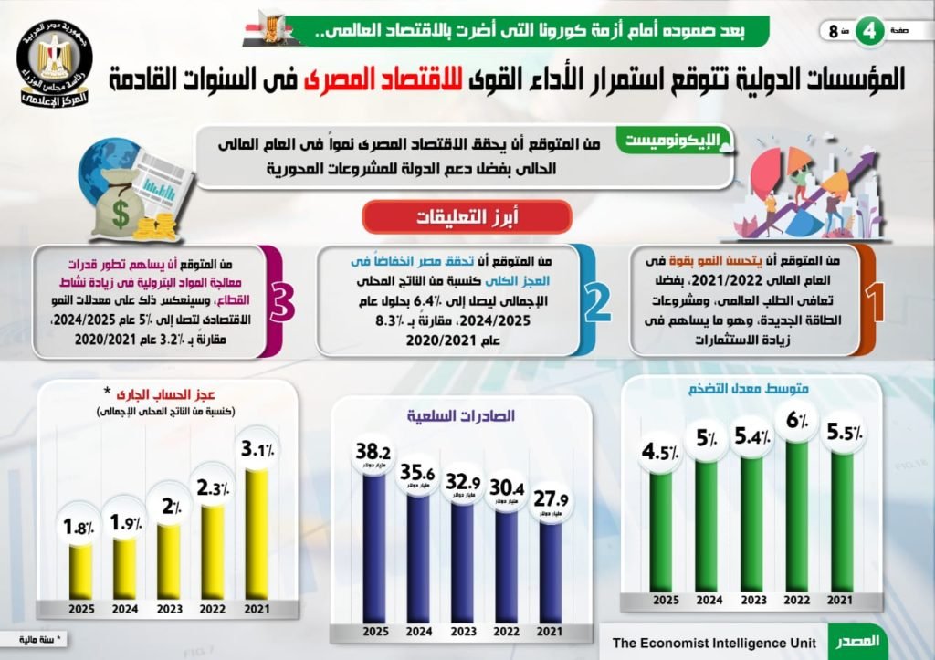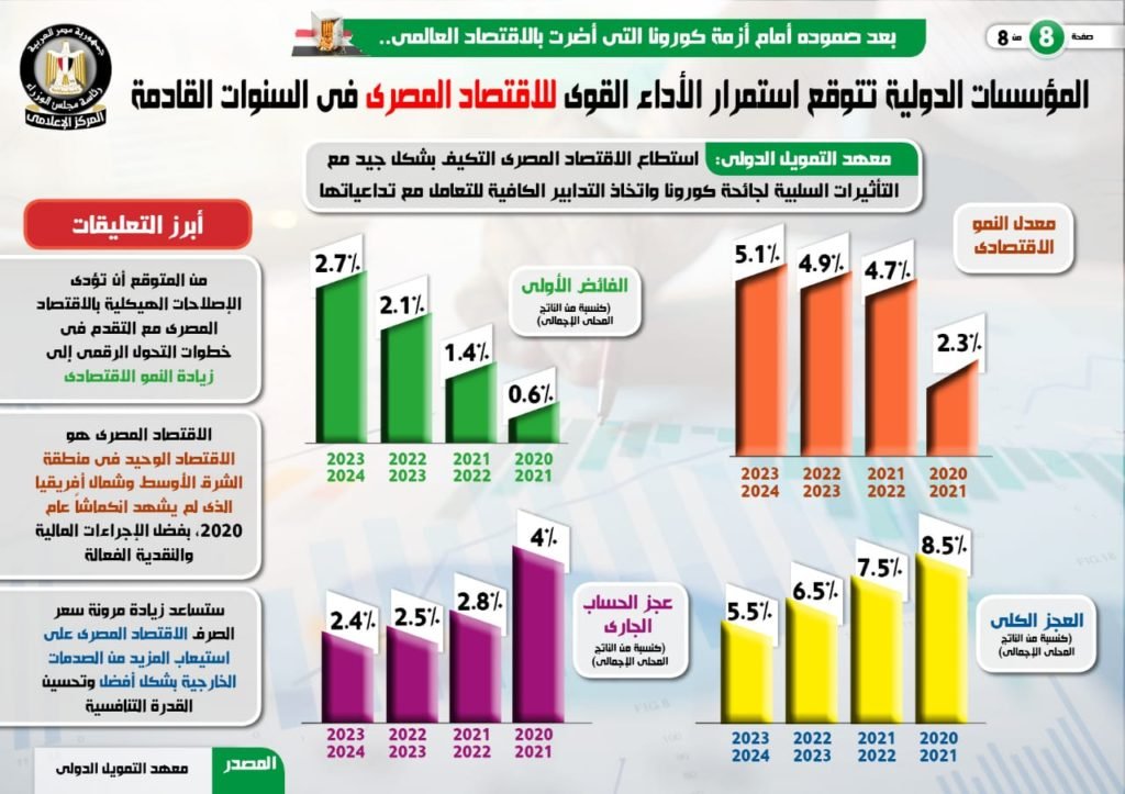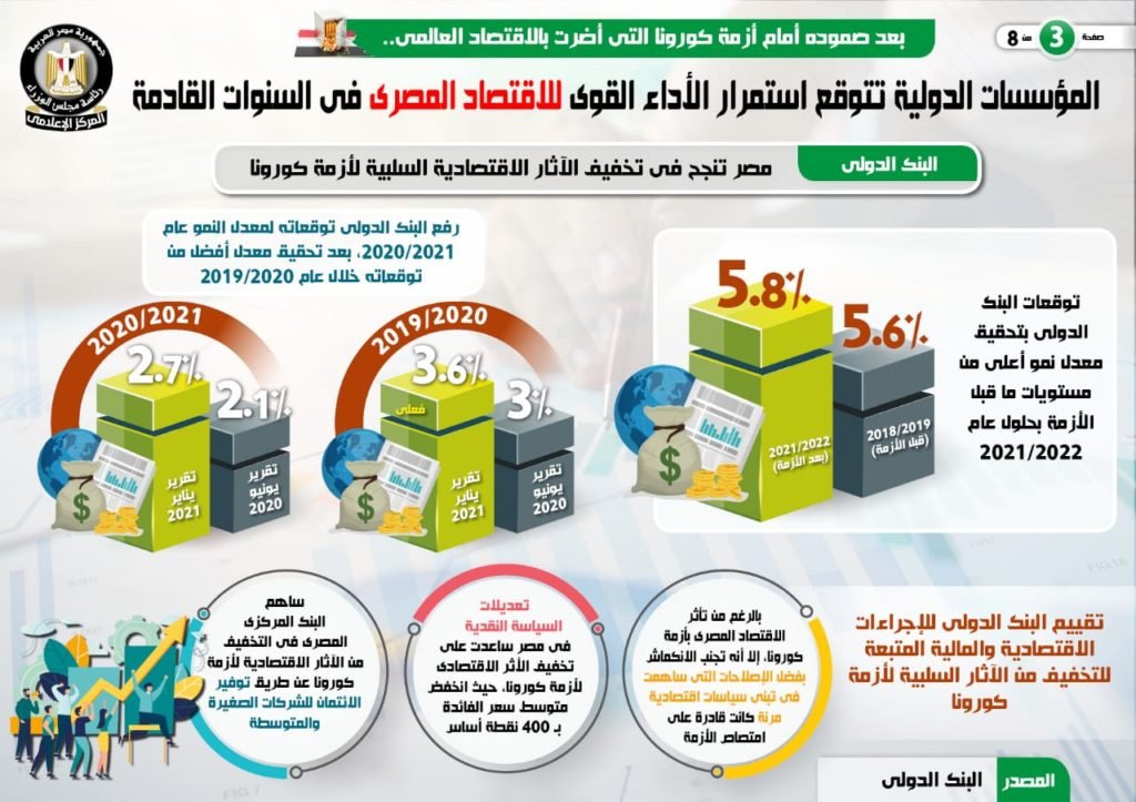 فى هذا الصدد، نشر المركز الإعلامى لمجلس الوزراء، تقريرًا تضمن إنفوجرافات تسلط الضوء على التوقعات المستقبلية للمؤسسات الدولية بشأن استمرار الأداء القوى للاقتصاد المصرى فى السنوات القادمة وذلك بعد صموده أمام أزمة كورونا التى أضرت بالاقتصاد العالمي.